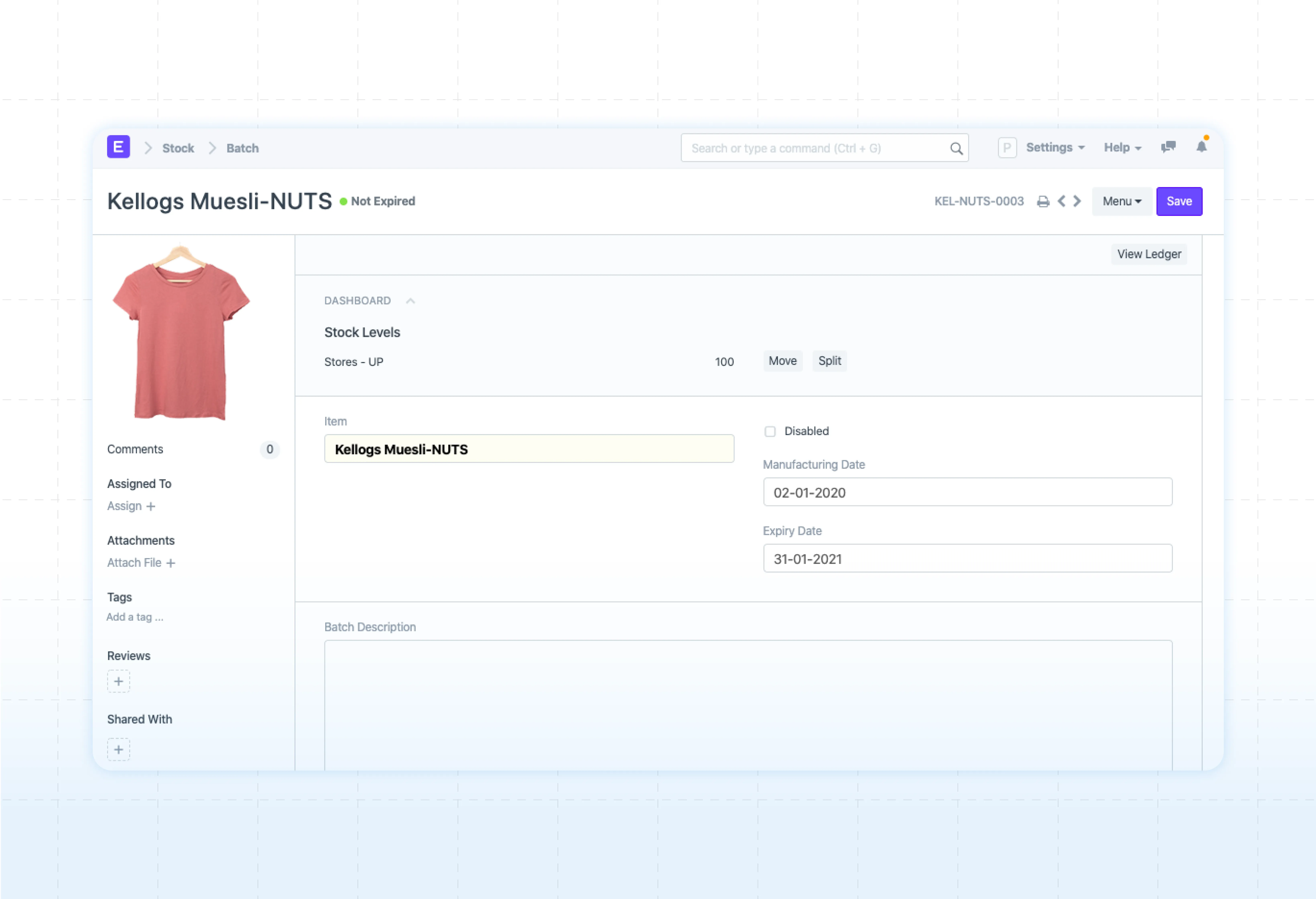 If you produce items in batches, use the ERPNext Batch master to maintain manufacturing dates, expiration dates, and other details. Move or split batches between warehouses and scan item barcodes with your device camera for real-time stock management.