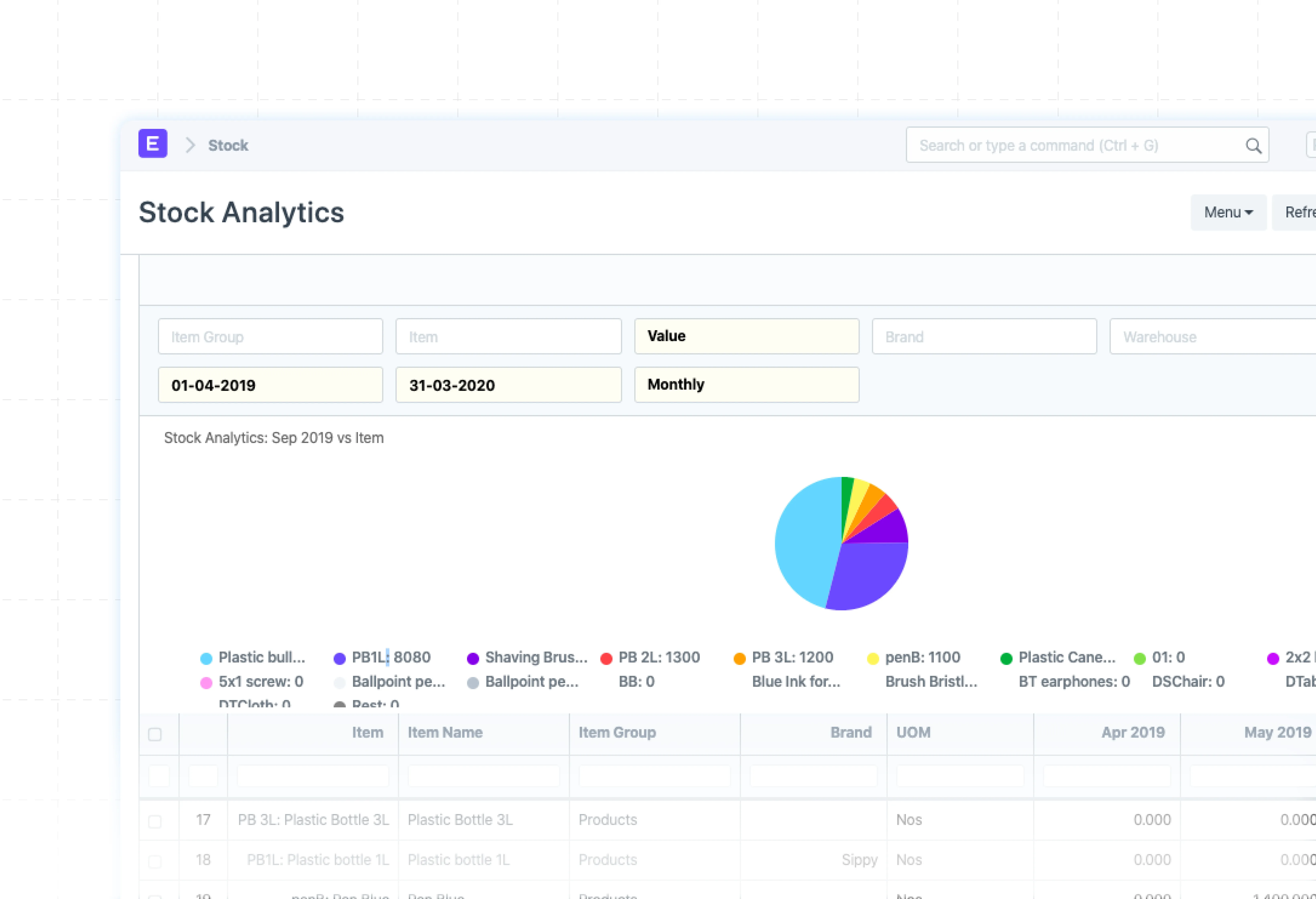 Filter by item group, brand, warehouse, or time period