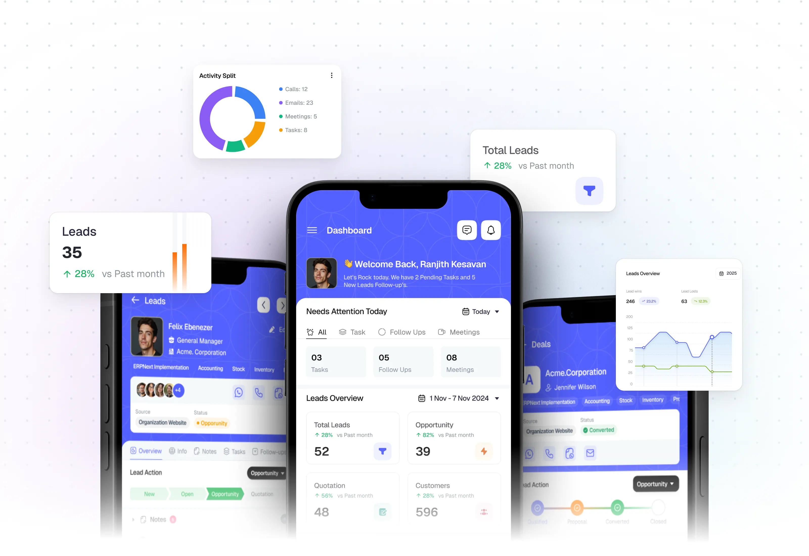 Manage activities connected to leads, deals, and customers.