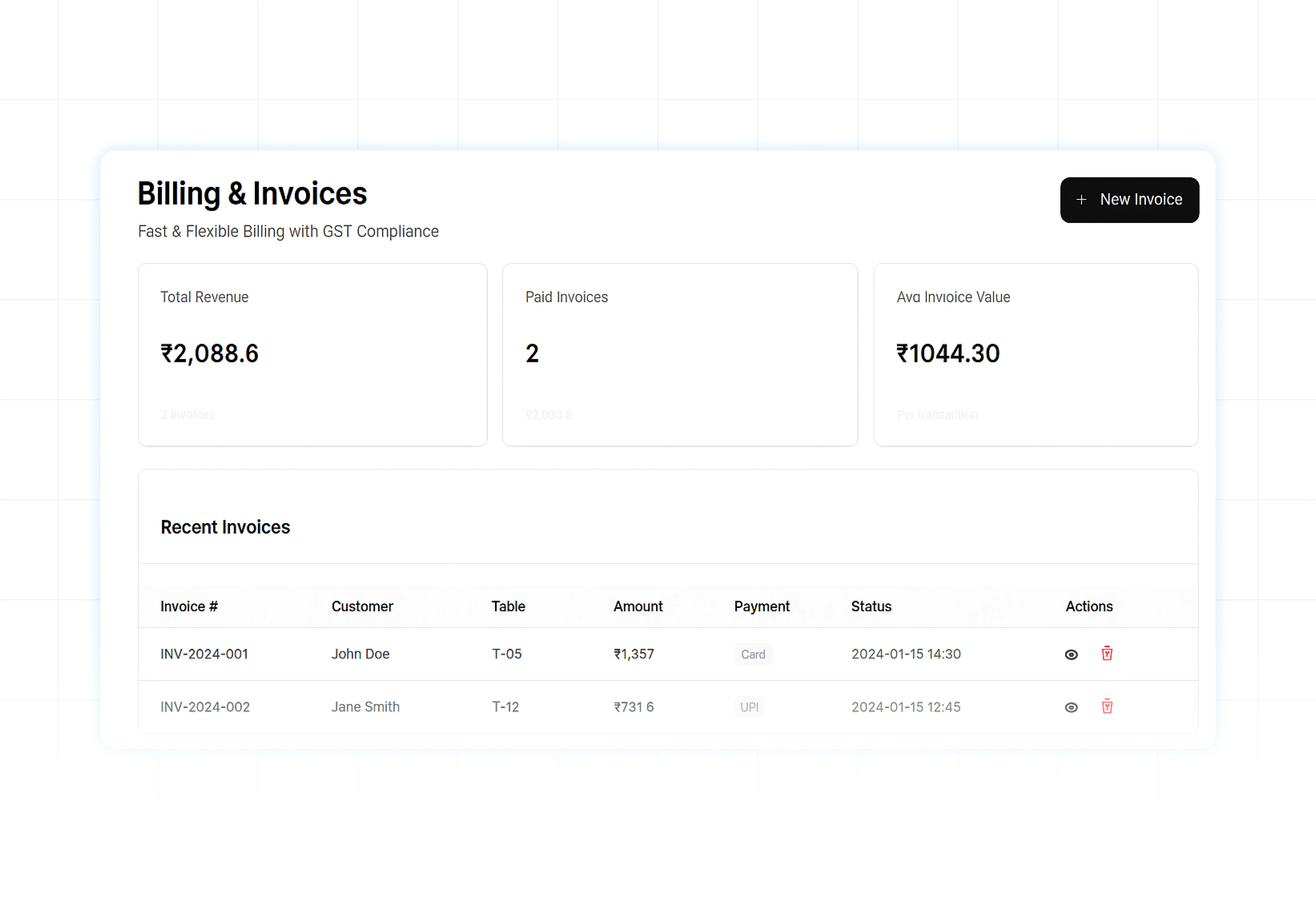 It supports GST-compliant invoices, cash, card, UPI, wallets, split/merge bills, and fast billing options.